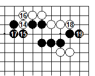 Д.5. Однако белые обычно продолжают 14 и 16. черные могут соединиться в 17, говоря распространение влево, на что белые будут защищать угол, обмениваясь ходами 18-19; или черные могут воспользоваться ходом 17 для атаки на правой стороне, в этом случае белые получают шанс разрезать на верхней стороне.