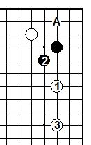 Д.1. когда белые намереваются играть 1 на правой стороне, черные отвечают 2, белые – 3. После этого возникает вопрос: как уживутся один белый и два черных камня, оставшиеся в углу? белые имеют в виду шанс сыграть в A и отнять у черных глазное пространство. черные и сами могут так сделать, но активнее им сыграть 1 на следующей диаграмме. Д.2. Надежный путь для белых в ответ на черный 1 – внезапный удар в угол 2. черные предпочитают закрыть белых ходом 3, а белые выживают ходами 4 и 6. Потерю угла более чем достаточно компенсирует их сильное влияние на верхней стороне.