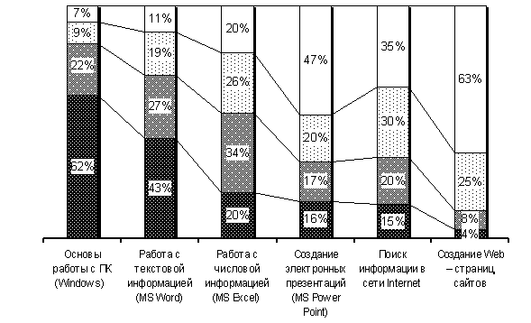 Примечание. По своему усмотрению вы можете включить в анкету социально – демографический блок. 2. Рекомендации по обработке данных исследования (Пример) Анкета, предложенная обучающимся, разработана с учётом компонентного состава информационной культуры. Цель исследования заключалась в выявлении уровня компьютерной грамотности студентов, а также умений эффективно находить, анализировать и использовать различную информацию. Выборку составили 107 студентов 2 курса. Выбор был обусловлен тем, что ко второму курсу обучающиеся уже в достаточной степени знакомы с инфраструктурой института, его информационными ресурсами (общая библиотека, специальная библиотека, кафедры и т.д.). Кроме того, до окончания ими института есть возможность и время для формирования составляющих информационной культуры. Далее представлен выборочный анализ результатов анкетирования, в ходе которого студентам было предложено ответить на ряд вопросов. Вопрос. Самостоятельно оцените свой уровень компьютерной грамотности по предлагаемым параметрам: основы работы с ПК, работа с текстовой информацией, работа с числовой информацией, создание электронных презентаций, поиск информации в сети Интернет, создание Web-страниц, сайтов. Для самооценки были предложены следующие уровни: 1 - конечно, знаю и могу научить (высокий); 2 - сяду за компьютер и вспомню (средний); 3 - представляю в общих чертах (ниже среднего); 4 - ничего не могу сказать (низкий). Диаграмма 1.