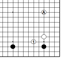 Д.2. Здесь белый 1 не так хорош. черный A удерживает белых от желанного распространения, а на нижней стороне черный 6 сулит шансы на захват территории. Даже если черные не сыграют 6, самый факт, что они могут сделать, достаточно ясно показывает, что белый 1 ошибочен. Лучший ход – в 3-3 – цукэ, описанное в параграфе 38. Кикаси Д.3. Если после Основного дзёсэки белые захотят воспрепятствовать Черному 6 на предыдущей диаграмме. Они сыграют кикаси в 1 на этой диаграмме. белые не хотят дать им сэнтэ, они могут сыграть в A и запереть черных в углу.