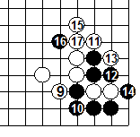 Д.7. Ход белых 5 здесь демонстрирует другую возможность. Так этот ход угрожает глазной форме черных в углу, им (черным) лучше сыграть 6, и белые могут закончить 7. Если ходы белых 5 и 7 дадут им хорошие границы территории на правой стороне, как на этой диаграмме, то это хорошие ходы. В противном случае, однако, белые должны поостеречься ввиду того, что черные после хода 6 получают сэнтэ.