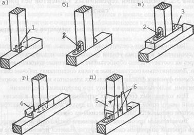 Рис. 3.3. Опирание стоек на горизонтальный деревянный элемент: а - фиксированный с помощью цилиндрических нагелей (1); б - то же, металлическими уголками (2); в - с подкладкой из твердых пород древесины (3); г - то же, из стального швеллера (4); д - с деревянными вставками (5) на болтах (6)