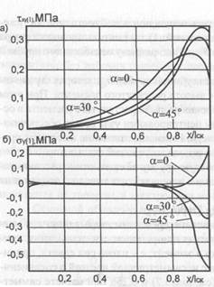 Рис. 3.9. Распределение касательных (а) и нормальных (б) напряжений по плоскости скалывания для 1СКI е = 10