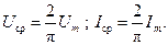 Обычно говоря о величинах периодических ЭДС, напряжений и токов, подразумевают их действующие значения. Действующие значения принято обозначать большими буквами без индексов так же, как постоянные значения. Подавляющее большинство измерительных приборов переменного напряжения и тока градуируется в действующих значениях. Действующими значениями обычно пользуются и при расчетах электрических цепей при гармоническом и произвольном периодическом воздействии. Среднее арифметическое значение синусоидальных ЭДС, напряжений и токов за период и за любое целое число периодов всегда равно нулю. Однако на практике представляет интерес знать среднее значение за половину периода (анализ схем выпрямления переменного тока). Под средним значением гармонических ЭДС, напряжения и тока будем понимать их средние значения за положительный полупериод
