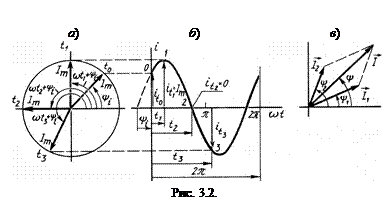При гармоническом изменении синусоидальной величины постоянной остается её амплитуда. Этим можно воспользоваться для определения мгновенного значения электрической величины, не рассматривая графика ее зависимости от времени. Синусоидальную функцию времени можно изобразить вектором, равным амплитуде данной функции, равномерно вращающимся с угловой скоростью ω. При этом начальное положение вектора определяется (для t =0) его начальной фазой ψ i. На рис. 3.2 показаны вращающийся вектор тока Iт (рис. 3.2, а) и график изменения тока i во времени (рис. 3.2, б). При изображении синусоидальных ЭДС, напряжений и токов из начала координат проводят векторы, равные амплитудным значениям этих величин, под углом ψ к горизонтальной оси. Положительные углы ψ откладываются против часовой стрелки. Если вращать вектор против часовой стрелки, то в любой момент времени он составит с горизонтальной осью угол, равный ω t+ψ. Проекция вращающегося вектора на ось ординат (ось мгновенных значений) равна мгновенному значению синусоидальной величины (ЭДС, напряжения, тока).