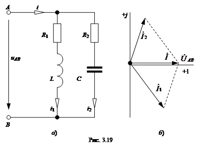 Резонанс токов наблюдается при параллельном соединении ветвей, в одной из которой находится индуктивный элемент, а в другой – емкостный элемент (рис. 3.19). Пусть на вход цепи подается синусоидальное напряжение иAB = Um sin(ω t +ψ u)