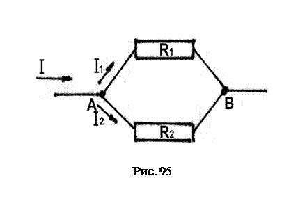 При параллельном соединении проводников (рис. 95) напряжение на участке АВ для обоих проводников будет одинаковым U = U1 = U2. На входе в группу параллельных проводников (в точке А) происходит разветвление тока. Из закона сохранения заряда следует, что ток I равен сумме токов I1 и I2 I = I1 + I2 =