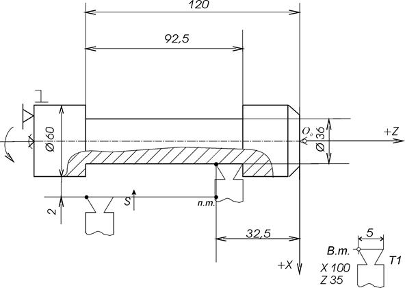 Фрагмент ВКП: N0 Т1 –встановлення прорізного різця в робочу позицію; N1 М3 – увімкнення шпинделя та задання йому обертання проти годинникової стрілки; N2 М 40 – ІІІ діапазон частот обертання шпинделя; N3 S600 – n = 600 об/хв.; N4 F20 – s = 0, 2 мм/об;