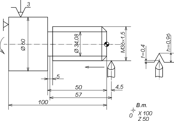 Приклад 22: Розробити керувальну програму нарізання різі М36× 1, 5 (рис. П.22.1). Початок системи координат деталі знаходиться в центрі правого торця.