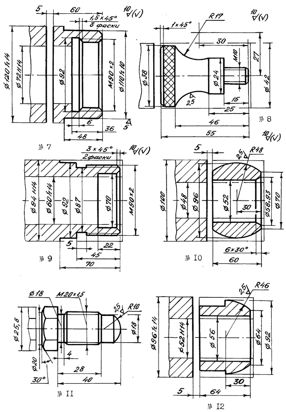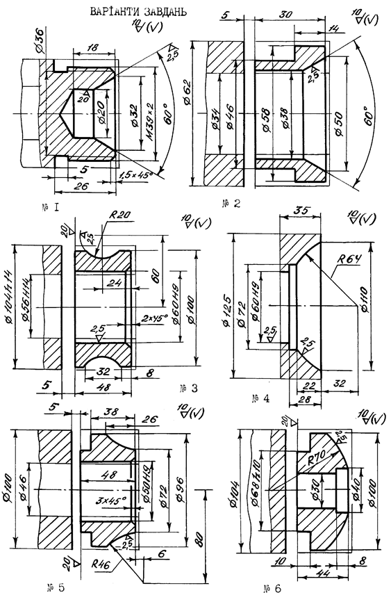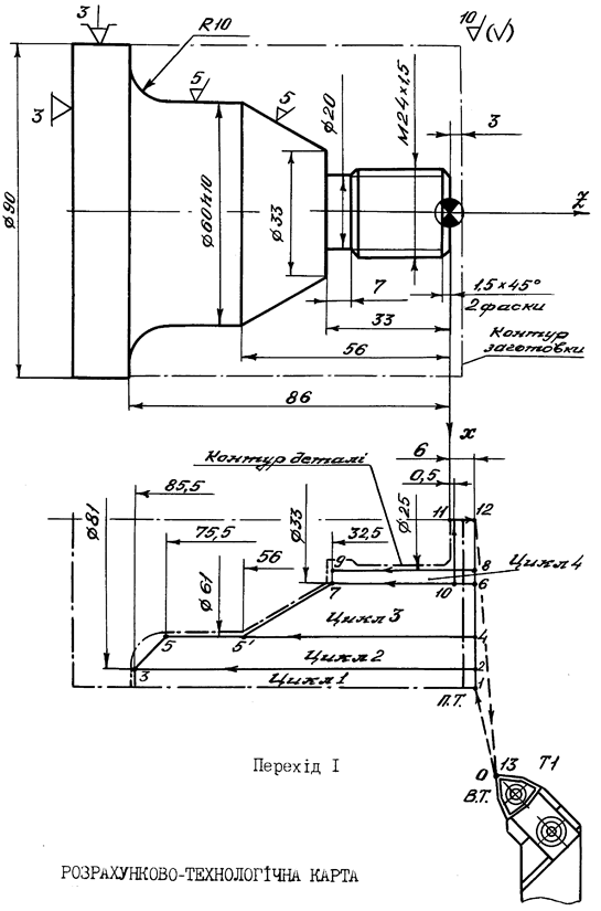 7.4 Зміст звіту 1. Назва роботи. 2. Завдання на виконання роботи: - операційний ескіз, оформлений у відповідності з із заданим варіантом деталі (додаток Г); - матеріал заготовки; - спосіб виготовлення заготовки. 3. Розпланування деталі на зони чорнової токарної обробки. 4. Маршрут механічної обробки на заданій операції, який оформляється у вигляді таблиці (додаток А). 5. Необхідні розрахунки та стислі пояснення прийнятих рішень (наприклад, призначення глибини різання під час зніманні напусків, обґрунтування розташування опорних точок, застосування постійних циклів тощо). 6. Вибір різального інструмента з вказаними параметрами різальної частини (j). Тип інструмента, матеріал різальної частини і кути заточки наводять в таблиці маршруту механічної обробки (Додаток А); ескізи інструментів показують на РТК. 7. Вибір режимів різання та припусків (за допомогою нормативного методу). Результати наводять у таблиці маршруту механічної обробки. 8. Оформлена розрахунково-технологічна карта у вигляді окремих креслень для кожного з переходів (додаток Б). 9. Текст керувальної програми з необхідними поясненнями (додаток В). 10. Аркуш паперу з накресленим верстатом фрагментом траєкторії та дооформленням цього фрагменту у відповідності з п. 2.6 розділу 2. 11. Висновки.