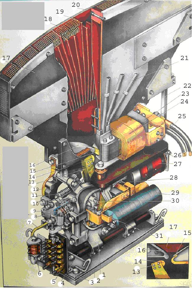 Конструкция и принцип действия. Быстодействующий выключатель БВП-5 состоит из следующих основных узлов: рамы 1, основание 2, контактного устройства 14-15, пневматического привода 7-8-9, системы дугогашения 16-24, электромагнитного удерживающего устройства 27, 34, 40 и блока вспомогательных контактов 5. Корпус выключателя состоит из угольников 3, скрепленных двумя изолированными стержнями 4, и рамы 1, состоящей из двух алюминиевых половин, связанных между собой болтами. Между рамами расположены магнитопровод с удерживающей катушкой 27; размагничивающий виток с сердечником 28; рычаг якоря 37, на котором шарнирно укреплен контактный рычаг 13с подвижным контактом, в средней части соединенный с двумя контактными пружинами 11, которые одновременно являются и выключающими; включающий рычаг пневматического привода с возвращающими пружинами 30 и цилиндр пневматического привода 8 с буфером для смягчения ударов рычага при выключении быстродействующего выключателя. Параллельно размагничивающему витку включен индуктивный шунт 29, состоящий из медной шины, на которой насажены диски из электротехнической стали. При коротком замыкании индуктивный шунт способствует срабатыванию выключателя при токе меньшем тока уставки, в связи с чем повышается коммутационная способность аппарата. Индуктивное сопротивление шунта больше индуктивного сопротивления цепи размагничивающего витка, поэтому при резком нарастании тока большая его часть проходит через размагничивающий виток быстродействующего выключателя, вызывая резкое уменьшение электромагнитных сил притяжения рычага якоря. Сверху на раме закреплена гетинаксовая плита 26, на которой укреплены неподвижный контакт и на пластмассовых изоляторах дугогасительная катушка 17 с шихтованным магнитопроводом 23. В зоне контактов магнитопровод имеет веерообразные полюсы 21для проведения магнитного потока через камеру. Между веерообразными полюсами помещается дугогасительная камера, состоящая из двух асбоцементных стенок 20с вклеенными перегородками 19, которые образуют лабиринт. В верхней части камеры установлены деионные решетки 18. Для предотвращения от выпадания деионных решеток установлен держатель из стеклопластика. В нижней части камеры расположены дугогасительные рога 16, один из которых соединен с неподвижным контактом, другой — со стальным шарниром. Шарниром камера соединена с рамой выключателя. Для уменьшения входной щели дугогасительной камеры и увеличения скорости прохождения электрической дуги установлена асбоцементная вставка. Работа выключателя происходит следующим образом. Нажав кнопку БВ кнопочного выключателя, подают питание на удерживающую катушку. Кратковременным включением кнопки Возврат БВ подают питание на катушку электромагнитного вентиля. Сжатый воздух давит на поршень, шток поршня передает давление на рычажную систему подвижного контакта, и растягивая контактную и возвращающую пружину, подводит якорь к полюсам магнитопровода удерживающей катушки. После разрыва цепи питания вентиля электропневматического привода кнопкой Возврат БВ сжатый воздух выходит из цилиндра. Включающий рычаг под действием возвращающей пружины отходит от контактного рычага. При этом якорь остается притянутым к полюсам магнитной системы удерживающей катушки и под действием контактной п