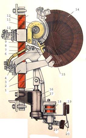 Назначение и технические данные. Контакторы ПК-14—ПК-19; ПК-21 - ПК-26; ПК-31 - ПК-36; ПК-41-ПК-46 предназначены для замыкания и размыкания силовых цепей электровоза под током. Конструкция контакторов всех типов аналогична. Различаются они наличием или отсутствием системы дугогашения, конструктивным исполнением дугогасительных камер, блокировок и включающих вентилей. Технические данные контакторов следующие: Номинальное напряжение силовой цепи.. 3000 В Номинальное напряжение цепи управления 50 В ПК-21 — ПК-26, ПК-31—ПК-36, ПК-41 — ПК-46, ПК-053Т ,,...... 500 А ПК14 – ПК19......... 350 А Номинальный ток блокировочных контактов.. 5 Разрыв контактов...... 24—27 мм Провал контактов.......... 10—12 мм Начальное нажатие, контактов. ………. 3, 5—5 кгс Конечное нажатие контактов, не менее... 27 кгс Нажатие блокировочных пальцев..... 1, 5—2, 5кгс Номинальное давление сжатого воздуха.... 5 кгс/см2 Наименьшее давление сжатого воздуха для нор- мальной работы ПК........ ……………………….. 3, 5 кгс/см2 Начальное давление сжатого воздуха для проверки пневматического привода на герметичность. 6, 75 кгс/см2 Суммарный вертикальный люфт шарнирных соединений, приведенный к подвижному контакту, не более............ ……………………………… 1, 5 мм Напряжение переменного тока частотой 50 Гц для испытания изоляции в течение 1 мин: силовой цепи ……………………………….9500 В цепи управления........ …………. 1500 В Масса контакторов: ПК-14 —ПК-19........... ………………. 12, 5—14, 3 кг ПК-21 —. ПК-26....... …………… 25—28 кг ПК-31—ПК-36........ …………………….. 28—31 кг ' Т1М1 —-ПК-46......... ……………. 31—38 кг ПК-053Т.......... ……………………………. 11 кг Конструкция и принцип действия. На изолированном металлическом стержне13 собраны все узлы контактора: кронштейн 10с неподвижным контактом 9 и дугогасительной катушкой 12; кронштейн 3подвижного контакта 8, который шарнирно соединен с рычагом 4; пневматический привод 16 через изоляционную тягу2. Пневматический привод состоит из цилиндра 16, выключающие пружины 22, поршня 23 с уплотнительной резиновой манжетой и электромагнитного включающего вентиля 18. При подаче питания на катушку вентиля сжатый воздух поступаетв цилиндр пневматического привода, поршень перемещает тягу, которая поворачивает рычаг и замыкает подвижной контакт с неподвижным. Одновременно происходит переключение блокировки 20, система которой связана с тягой. При отключении включающей катушки и вентиля сжатый воздух из цилиндра выпускается, и поршень под действием сжатой пружины быстро возвращается в исходное положение, размыкая подвижной контакт с неподвижным. По способу подачи воздуха к приводу через отверстие и наличию блокировки контакторы имеют шесть исполнений I—VI. На электровозах ВЛ10 с № 1537 для уменьшения удара подвижных частей при включении на всех ПК установлены вентили с уменьшенным калиброванным отверстием, равным 1, 5 мм. Контакторы ПК-31—ПК-36, ПК-41—ПК-46 имеют дугогасительные камеры 14 трехщелевого типа, состоящие из двух асбестоцементных стенок и двух внутренних асбестоцементных перегородок, скрепленных болтами. Внутри камеры имеется дугогасительный рог 15. Снаружи камеры расположены полюсы для направления магнитного потока в зону гашения дуги. Полюсы плотно прилегают к сердечнику дугогасительной катушки 12, которая укреплена на неподвижном кронштейне. Контакторы ПК-21—ПК-26 имеют лабиринтно-щелевые камеры, выполненные из двух спрессованных боковин из дугостой