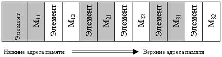 Элементы абстрактного массива в памяти машины физически располагаются последовательно, согласно описанию. При этом каждый элемент занимает в памяти количество байт, соответствующее его размеру. Например, если массив состоит из элементов типа integer, то каждый элемент будет занимать по два байта. А весь массив займет S^2 байта, где S – количество элементов в массиве. А сколько места займет массив, состоящий из массивов, т.е. матрица? Очевидно: S i^S j, где S i - количество строк, а S j – количество элементов в каждой строке. Например, для массива типа Matrix = array [1..3, 1..2] of integer; потребуется 12 байт памяти. Как будут располагаться в памяти элементы этого массива? Рассмотрим схему размещения массива M типа matrix в памяти.