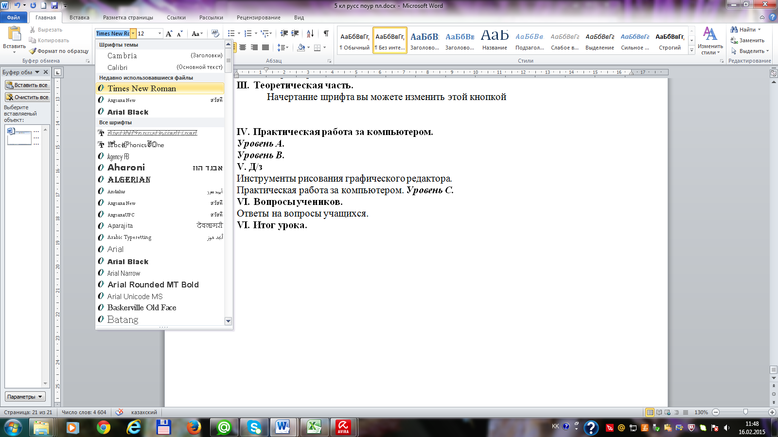 Для символа можно установить: o вид шрифта (гарнитура); o размер (кегль); o цвет. Для деловых писем, рефератов и т.п. рекомендуется размер шрифта 14 пт., гарнитура Arial или Times New Roman. При форматировании выделенного текста также удобно бывает использовать сочетания клавиш. Например, чтобы установить начертание полужирным, нажмите Ctrl+B, Ctrl+I, Ctrl+U. Коротко о главном: · Сделать текст документа привлекательным позволяет форматирование шрифта. · Основные параметры форматирования шрифта – гарнитура, кегль, цвет. · Команды форматирования можно выбрать на вкладке ленты Главная. ІV. Практическая работа за компьютером. Уровень А. (стр.-167) Уровень В. (стр.-167)