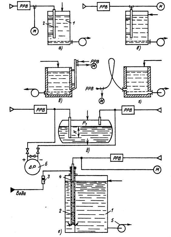 В пьезометрических системах измерения уровня для продувания через трубку помещённую в жидкость, дозированного расхода воздуха наиболее часто применяют регуляторы расхода воздуха типа РРВ-1. Принцип действия этого регулятора основан на автоматическом поддержании постоянного перепада давления на дросселе, в результате чего обеспечивается постоянный расход воздуха через этот дроссель. Принципиальная пьезометрическая схема измерения уровня в открытом резервуаре представлена на рис. 2, а, б, в, г. На рис 2, д показана принципиальная пьезометрическая схема измерения уровня жидкости в резервуаре, находящемся под давлением. Для исключения влияния давления в резервуаре на показания прибора, измеряющего уровень жидкости, применяется дифференциальный метод измерения с двумя регуляторами расхода. От одного регулятора расхода воздух подаётся в пьезометрическую трубку, от другого в верхнюю часть резервуара над жидкостью. Разность давлений в трубках, пропорциональная уровню жидкости, измеряется дифманометром. В системах измерения нижний конец пьезотрубки должен находится на нижнем контролируемом уровне жидкости, но не ниже 80 мм от дна резервуара. Расход воздуха устанавливается минимальным, чтобы перепад давления на пьезотрубке был возможно меньшим, так как это определяет погрешность измерения пьезометрическим методом. Минимальный расход воздуха обеспечивается постоянным, без запаздывания, выходом воздуха из пьезометрической трубки при изменениях уровня. Обычно расход воздуха принимается равным 0.1 – 0.2 м3/ч. Если пренебречь перепадом давления на пьезометрической трубке, то уровень в резервуаре