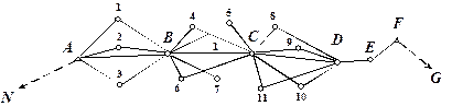 4. Полярно-лучевой метод. При наличии электронных дальномеров и тахеометров съемочное обоснование можно создавать полярно-лучевым методом. Схемы сетей могут быть разнообразными. Например, между исходными пунктами А и F прокладывается основной ход ABCDEF (рис. 2.17).
