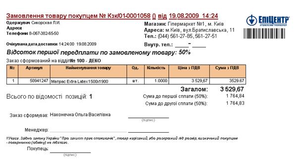 Назва документу: Книга замовлень Скорочено: (Кзк). Ким формується: асистентом начальника відділу або начальником відділу. Призначення: покупець при відсутності потрібного товару може звернутися до інфобоксу відділу з проханням замовити даний товар. Уповноважена особа пересвідчуються, що такий товар є у постачальника, формує Кзк, де обов’язково вказує відсоток передплат та заповнює потрібні дані про клієнта, і віддає його покупцеві, який здійснює на касі передплату і отримує Кзк. При надходженні замовленого товару працівники інфобоксу попереджають покупця у телефонному режимі. На основі Кзк в інфобоксі відділу формують Ррз і касир на основі цього документу (Ррз) відвантажує товар покупцю.