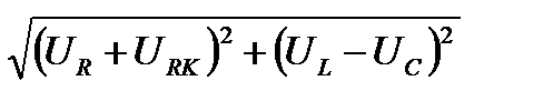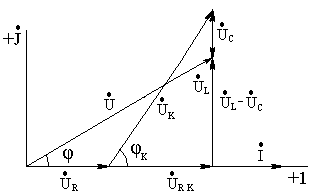 Рис. 3.1 · падения напряжения на активном сопротивлении uR=i(R+RK); где RK – активное сопротивление катушки индуктивности, · напряжения, уравновешивающего э.д.с. самоиндукции uL= - ε L; · напряжения, приложенного к зажимам конденсатора uC. Тогда общее напряжение для цепи записывается: для мгновенных значений напряжений u = u R+ uL + uC; для комплексных значений напряжений В цепи последовательного соединения активного, индуктивного и ёмкостного сопротивлений вектор напряжения опережает вектор тока или отстаёт от него на угол сдвига фаз φ в зависимости от того, какой характер носит схема (ёмкостный или индуктивный). Векторная диаграмма цепи (с учётом преобладающего влияния индуктивного сопротивления) имеет вид (рис. 3.2).