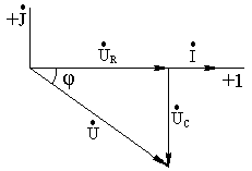 cosφ = sinφ = s inφ K = Рис. 3.3 Полученные соотношения могут быть использованы для вычислений активных и реактивных составляющих напряжения и сопротивлений по известным величинам тока, напряжения и мощности. 2. Последовательное соединение активного сопротивления R и конденсатора с сопротивлением XC. (В схеме рис. 3.1 предполагают, что ZK=0). Напряжение на зажимах данной цепи Величина приложенного напряжения U = Ток в цепи I = Векторная диаграмма рассматриваемой цепи имеет вид (рис. 3.4).