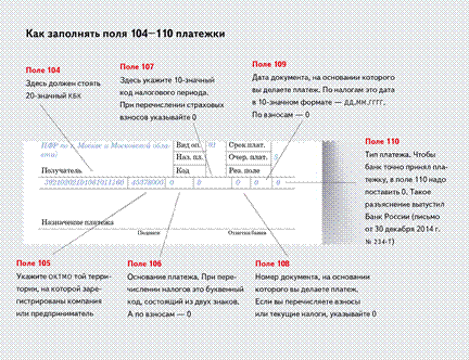 * Формы документов и реквизиты платежки указаны на момент подписания номера в печать. Реквизиты платежки в этой колонке перечислены по порядку, начиная с поля 104, заканчивая полем 110. Наглядный фрагмент ниже.