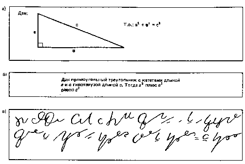Вы не ошиблись, прочитав название этого раздела. Быстро писать, а точнее, конспектировать можно. Учеными разработана специальная система, которая получила название скоростное конспектирование. Автор методики Л. Ф. Штернберг утверждает, что можно сравнительно просто научиться конспектировать в два-три раза быстрее, причем эта система значительно проще стенографии. Давайте разберемся в элементах разработанной методики. Прежде всего выполним простой эксперимент, демонстрирующий суть методики. Для этого необходимо подготовить небольшое пособие. Возьмите 3 стандартные библиографические карточки (125Х75 мм) или 3 листа бумаги в половину тетрадной страницы. На первой карточке нарисуйте то что изображено на рис. 40 а, на вторую перепишите текст, приведенный на рис. 40 б, а на третьей карточке то, что изображено на рис. 40 в (вы можете наложить кальку, чтобы перерисовать это, а потом кальку наклеить на карточку). Теперь покажите первую карточку вашему товарищу и спросите: что на ней написано? Ответ будет почти мгновенным: «Теорема Пифагора». Теперь возьмите вторую карточку и покажите ее другому вашему другу. Ответ вы получите тот же самый, но вам придется подождать 21—25 сек., пока он будет читать и осознавать текст. Третью карточку нужно показать человеку, знающему стенографию. В этом случае ответ вы получите через 30—40 сек. Записанное на ней надо не просто прочитать, но и расшифровать. Теперь давайте поразмышляем: почему же такая разница во времени восприятия и обработки одного и того же сообщения? Все дело в том, как оно записано. Исходным вариантом сообщения является текст 40 б, но, согласитесь, так писать его довольно долго. Текст 40 в пишется значительно быстрее, но читается хуже. А вот вариант 40а — это уже обработанный для наилучшей восприятия текст, который читается моментально да и пишется быстро. Давайте понаблюдаем за авторами этих текстов — школьниками А, Б и В — 1 классе (т. е. при записи текста) и при подготовке к экзамену (т. е. при чтения своего конспекта).