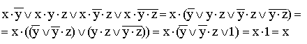 8) (общий множитель x выносится за скобки, комбинируются слагаемые в скобках — первое с третьим и второе с четвертым, к дизъюнкции применяется правило операции переменной с её инверсией);
