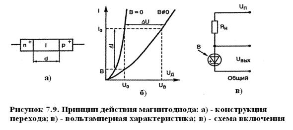 Магнитодиоды представляют собой полупроводниковые диоды, у которых вольт - амперная характеристика изменяется под действием магнитного поля. У обычных полупроводниковых диодов тонкая база и магнитное поле незначительно изменяет вольт - амперную характеристику. А магнитодиоды имеют толстую («длинную») базу, в которой длина пути тока много больше диффузионной длины инжектированных в базу носителей. Обычно толщина базы составляет несколько миллиметров. В этом случае сопротивление базы соизмеримо с прямым сопротивлением р-п перехода. При увеличении индукции поперечного магнитного поля сопротивление базы значительно возрастает, подобно тому как это происходит в магниторезисторе. Возрастает общее сопротивление диода, и прямой ток уменьшается. Такое уменьшение тока связано еще и с тем, что при увеличении сопротивления базы происходит перераспределение напряжения, т. е. увеличивается падение напряжения на базе и соответственно уменьшается напряжение на р-п переходе, от чего дополнительно снижается ток. Изготовляют магнитодиоды на основе полупроводников с возможно большей подвижностью носителей. Часто магнитодиоды делают со структурой p - i - n, причем удлиненная область i обладает значительным сопротивлением и именно в ней возникает резко выраженный магниторезистивный эффект. Чувствительность к изменению магнитной индукции у магнитодиодов выше, нежели у преобразователей Холла. Такой магнитодиодный эффект наглядно показывают вольт - амперные характеристики магнитодиода (рисунок 7.9). Из них хорошо видно, что с повышением магнитной индукции прямой ток уменьшается. Следует отметить, что для магнитодиодов характерно значительно большее прямое напряжение, чем для обычных диодов, что объясняется большим сопротивлением базы. Магнитодиоды нашли широкое и разнообразное применение: в бесконтактных кнопках и клавишах, служащих для ввода информации; в качестве датчиков положения движущихся предметов; для считывания магнитной записи информации; для измерений и контроля различных неэлектрических величин. На магнитодиодах могут быть построены бесконтактные реле тока. Схема на магнитодиодах может заменять коллектор у электродвигателя постоянного тока. Возможны магнитодиодные усилители постоянного и переменного тока. Входом у них является обмотка электромагнита, магнитное поле которого управляет магнитодиодом, а выходом служит цепь самого диода. Для токов до 10А можно получить коэффициент усиления в несколько сотен.