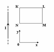 Прямоугольная проволочная рамка расположена в одной плоскости с прямолинейным длинным проводником, по которому течет ток I. Индукционный ток в рамке будет направлен по часовой стрелке при ее …