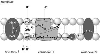 Ланцюг переносу електронів від NADH та FADH2 на кисень. Перенесенняелектронів від NADH до О2 включає ряд переносників, які локалізовані у внутрішній мембрані мітохондрій. За винятком убіхінону і цитохрому С, це складні білкові комплекси. NADH-дегідрогеназа (NADH-Q-редуктаза, комплекс I) складається з декількох поліпептидних ланцюгів. Роль простетичної групи виконує FMN. Єдиний субстрат ферменту – NADH, з якого 2 електрони і протон переносяться на FMN з утворенням FMNH2. Другий протон поглинається з матриксу. Реакція протікає за рівнянням: NADH + Н+ + Е (FMN) ® NAD+ + E (FMNH2). З FMNH2 електрони переносяться потім на ряд залізо-сірчаних білків (Fe), що виконують роль другої простетичної групи в молекулі NADH-дегідрогенази. Атоми заліза в цих білках (негемове залізо) зібрані в кілька груп, так званих залізо-сірчаних центрів. FeS-центри входять до складу багатьох білків (флавопротеїнів, цитохромів), які беруть участь в окисно-відновних реакціях. Відомі 3 типи FeS-центрів (Fe, Fe2S2, Fe4S4), в яких атом заліза зв'язаний з атомом сірки залишків цистеїну або неорганічної сірки. NADH-дегідрогеназа містить кілька центрів типу Fe2S2 і Fe4S4. Атоми заліза в таких центрах можуть приймати і віддавати електрони по черзі, переходячи у ферро- (Fe2+) і ферри- (Fe3+) стани. Від залізо-сірчаних центрів електрони переносяться на кофермент Q (убіхінон). Убіхінон виконує колекторну функцію, приєднуючи електрони від NADH-дегідрогенази та інших флавінзалежних дегідрогеназ, зокрема, від сукцинатдегідрогенази. Убіхінон бере участь у реакціях типу: E (FMNH2) + Q ® Е (FMN) + QH2. Цитохроми або гемопротеїни присутні в усіх типах організмів. У клітинах еукаріотів вони локалізовані в мітохондріальних мембранах і в ЕР. Відомо близько 30 різних цитохромів. Усі цитохроми в якості простетичної групи містять гем. У залежності від здатності поглинати світло у визначеній частині спектра всі цитохроми поділяють на групи а, b, с. Усередині кожної групи окремі види з унікальними спектральними властивостями позначають цифровими індексами (b, b1, b2 і т.д.). QH2-дегідрогеназа (коензим Q-цитохром с-редуктаза, комплекс III) складається з 2 типів цитохромів (b1 і b2) і цитохрому с1. QH2-дегідрогеназа переносить електрони від убіхінолу на цитохром с. Усередині комплексу III електрони передаються від цитохромів b на FeS-центри, далі на цитохром с1, а потім на цитохром с. Групи гема, подібно FeS-центрам, переносять тільки по одному електрону. Таким чином, від молекули QH2 2 електрони переносяться на 2 молекули цитохрому b. Як проміжний продукт у цих реакціях переносу електронів можливе утворення вільного радикала семіхінону. У цитохромах типу b гем не зв'язаний ковалентно з білком, а в цитохромах с1 і с він приєднується до білка за допомогою тіоефірних зв'язків. Ці зв'язки утворюються шляхом приєднання 2 цистеїнових залишків до вінільних груп гема. Організація дихального ланцюга в мітохондріях. Основні переносники електронів вбудовані у внутрішню мембрану мітохондрій і організовані в 4 комплекси, що є розташованими у визначеній послідовності (векторно). У цій послідовності їх стандартні окисно-відновні потенціали стають більш позитивними в міру наближення до кисню. Кожна ланка цього ланцюга специфічна у відношенні донора й акцептора електронів. На першому етапі дегідрогенази каталізують відщіплення водню від різних субстратів. Якщо субстратами служать a-гідроксикислоти