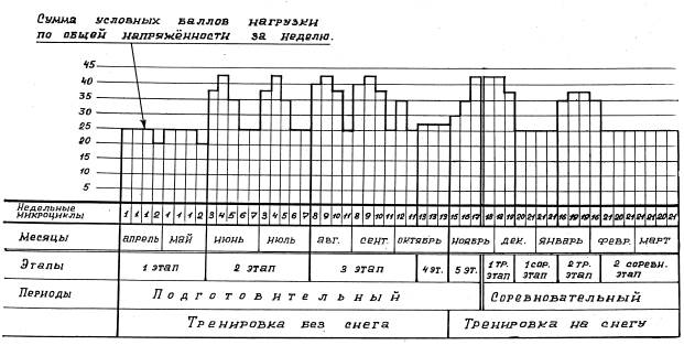 ГОДОВОЙ ЦИКЛ ТРЕНИРОВКИ Структура годового цикла. Планирование недельных микроциклов разных режимов напряженности, направленности и специфичности на этапах годового цикла тренировки. График режимов нагрузки по общей напряженности недельных микроциклов на этапах годового цикла тренировки.