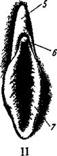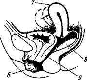 Рис. 13 Изменения клитора и малых половых губ, характерные для женского полового цикла: I - невозбужденное состояние: 1 - тело клитора, 2 - колпачок клитора; 3 - головка клитора; 4 малые половые тубы; II - фаза возбуждения* 5 - увеличение в диаметре тела клитора; 6 -увеличение головки клитора; 7 - увеличение объема малых половых губ, III - фаза плата; 8 - закрытие клитора колпачком; 9 - дальнейшее увеличение малых половых губ, на фазе плато создается впечатление, что клитор " исчезает'', скрываясь под клиторным колпачком; фаза оргазма не показана из-за отсутствия достаточной информации предполагаемого или желательного уровня, то в дальнейшем они окажутся в незавидном положении. Плато На фазе возбуждения наблюдается явное нарастание сексуального напряжения, значительно превышающее исходный уровень (т.е. уровень напряжения в невозбужденном состоянии). На рис. 10 показано, что на фазе " плато" возбуждение не уменьшается и не нарастает, хотя его усиление потенциально приводит к стадии оргазма. Продолжительность " плато" может быть различна. У мужчин, испытывающих затруднение в сдерживании эякуляции, эта фаза может быть очень короткой. У некоторых женщин короткая фаза " плато" может предшествовать особенно интенсивному оргазму. Для остальных людей замедленное, спокойное удовлетворение на уровне " плато" представляет собой " вершину" интимного эротического единения, которое само по себе доставляет предельное удовольствие. На фазе " плато" прилив крови вызывает у женщин увеличение в объеме тканей, расположенных в нижней трети влагалища. В результате реакции, называемой образованием оргастической манжетки, сужается входное отверстие вла-