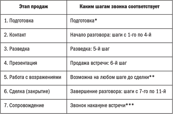 Как видите, соответствие полное. Подготовка* – это само собой разумеющееся, я даже не внес ее в алгоритм. Работа с возражениями** может произойти на любом шаге до сделки. Сопровождение*** соответствует сопровождающему звонку за два‑ три часа до встречи (вы отработали его в главе 11).