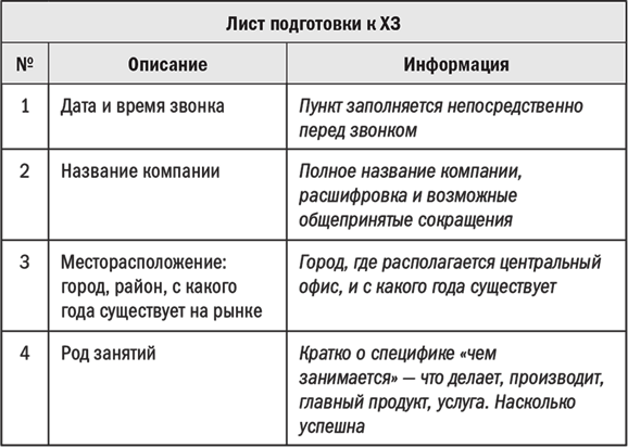 Сейчас, когда мы освоили первые фразы разговора с ЛПР, мы не можем пойти дальше, не обсудив адресную подготовку к общению именно с ним. Ключевая часть разговора с ЛПР базируется на подготовке, а звонок «экспромтом» может стоить нам клиента. Сразу перейдем к основному инструменту – «листу подготовки ХЗ», который рекомендую заполнять на каждого клиента накануне звонка. Этот лист помогает структурировать информацию, а впоследствии и фиксировать ее, например в CRM, а также контролировать работу отдела, если вы руководитель. Внимательно ознакомьтесь, он очень прост.