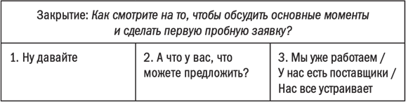 Прежде чем продолжить скрипт, кратко рассмотрим каждый из возможных ответов. 1. «Ну давайте» и любой синоним этой фразы – самый желаемый результат. Это прямое согласие работать с нами. 2. «А что у вас? Что можете предложить?» – это косвенное согласие и проявление интереса. За этими словами, возможно, скрывается возражение и некоторое сомнение, но в принципе для нас это почти так же здорово, как и первый вариант. Если на любое закрытие или предложение нам отвечают вопросом «А что вы можете предложить?» или «А что у вас?», то это в 100 % случаев означает интерес или как минимум готовность человека продолжить переговоры. 3. «Мы уже работаем с другими, у нас есть поставщики» и т. п. фразы – это возражение!