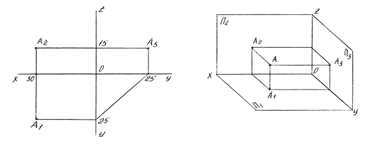 Рисунок 5 – Построение эпюра и наглядного изображения точки А (30; 25; 15)