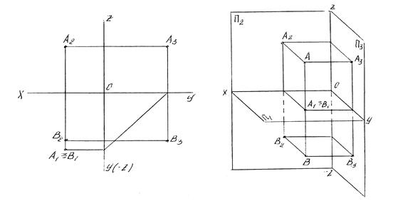 Рисунок 6 – Построение точки В симметричной точки А относительно плоскости П1 ВОПРОСЫ К ЗАНЯТИЮ 1. Что такое плоскость проекций? 2. Что такое ось проекций? 3. По каким координатам строится горизонтальная проекция точки? 4. По каким координатам строится фронтальная проекция точки? 5. По каким координатам строится профильная проекция точки? 6. Как образуется комплексный чертеж (эпюр) точки? 7. Что такое линия связи? 8. Как расположены линии связи относительно плоскостей проекций? 9. Какой координатой определяется расстояние от точки до плоскости проекций П1? 10. Какой координатой определяется расстояние от точки до плоскости проекций П2? 11. Какой координатой определяется расстояние от точки до плоскости проекций П3? 12. В каких октантах координата Y имеет положительные знаки? 13. В каких октантах координата Y имеет отрицательные знаки? 14. В каких октантах координата Z имеет положительные знаки? 15. В каких октантах координата Z имеет отрицательные знаки? 16. Какая из координат точки равна нулю, если точка лежит на плоскости проекций П1? 17. Какая из координат точки равна нулю, если точка лежит на плоскости проекций П2? 18. Какая из координат точки равна нулю, если точка лежит на плоскости проекций П3? 19. Сколько координат точки равны нулю, если точка лежит на оси проекций?