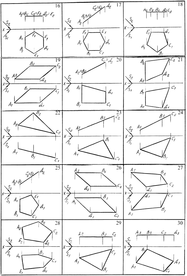 Задача 1. Построить действительные и мнимые тени точек А и В. Данные для решения задачи 1 взять из таблицы 13. Образец решения задачи приведен на рисунке 29. Задача 2. Построить тени прямых АВ и СД, падающие на плоскости П1 и П2. Данные для решения задачи взять из таблицы 14. Образец решения задачи приведен на рисунках 30 и 31. Задача 3. Построить тень заданной плоской фигуры, падающую на плоскости П1 и П2. Данные для решения задачи взять из таблицы 15. Образец решения задачи приведен на рисунке 32. Таблица 13 – Данные для решения задачи 1 (мм)