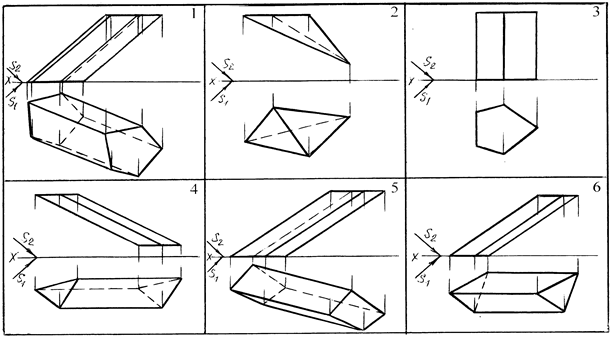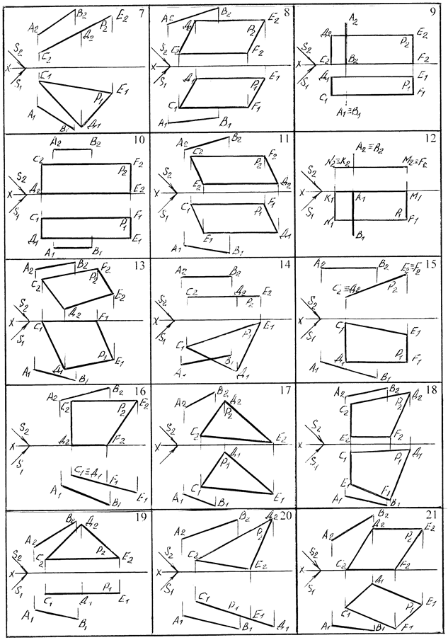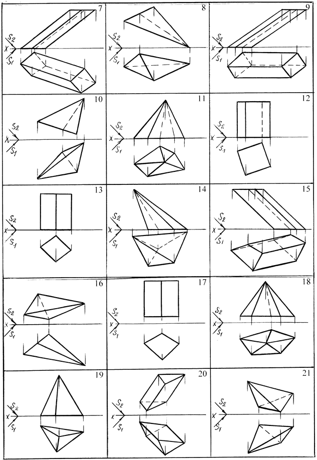 Задача 1. Построить тень прямой АВ, падающую на заданную плоскость Р. Данные для решения задачи взять из таблицы 16. Образец решения задачи приведен на рисунках 33 и 34. Задача 2. Построить собственную и падающую тени заданного геометрического тела. Данные для решения задачи приведены в таблице 17. Образцы решения задачи приведены на рисунках 35 и 36. Таблица 16 – Данные для решения задачи 1