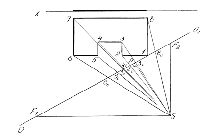Рисунок 45 – Выбор точки зрения При построении перспективы чаще всего применяется метод архитекторов. Построение перспективы плоской фигуры начинают с построения аппарата линейной перспективы на ортогональных проекциях фигуры. На рисунке 46а показаны выбор точки зрения S, основания картинной плоскости ОО1 и линии горизонта hh1. На этом же чертеже находят точки схода прямых, параллельных оси X (F1) и перпендикулярных оси Х (F2). Затем проводят горизонтальные проекции проецирующих лучей вершин заданной фигуры S2, S3 и т.д. и отмечают точки пересечения этих лучей с основанием картины ОО1 – точки 20, 30, 40 и т.д. После этого на поле чертежа проводят две горизонтальные прямые ОО1 и hh1, на которых отмечают точки Р и Р1 (рисунок 46 б). На линии горизонта от точки Р откладывают отрезки РF1 = Р1F1 и РF2 = Р1F2, взятые с рисунка 46 а. Затем на прямой ОО1 отмечают точки 10, 20, 30, 40, 50, 60, 70 и 80, перенесенные с помощью полоски бумаги. Перспектива точки 1 уже известна, т.к. она принадлежит основанию картины по построению. С точкой 1 связаны две прямые 1-6 и 1-8, для построения перспектив которых достаточно соединить прямыми точку 10 с точками F1 и F2. Прямой 1-6 принадлежат точки 2, 5, 6, а прямой 1-8 точка 8. Перспективами этих точек будут точки пересечения прямых 10F1 и 10F2 с перпендикулярами, восстановленными из точек 20, 50, 60 и 80. Для определения положения точек 3, 4, и 7 соединим прямыми линиями точки 2, 5 и 6 с точкой F2, а затем отметим точки пересечения этих прямых с перпендикулярами, восстановленными из точек 30, 40 и 70.