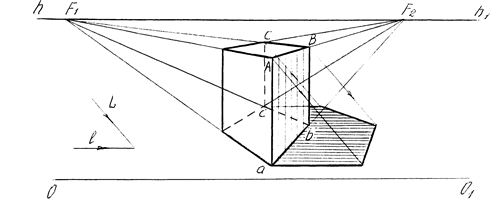 Теоретическая часть. Построение перспективы геометрического тела начинают с построения перспективы его основания, как было описано в практическом занятии 8