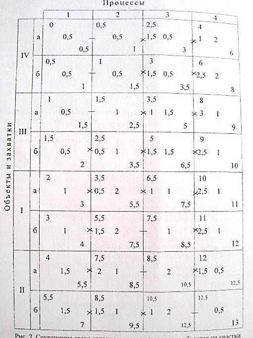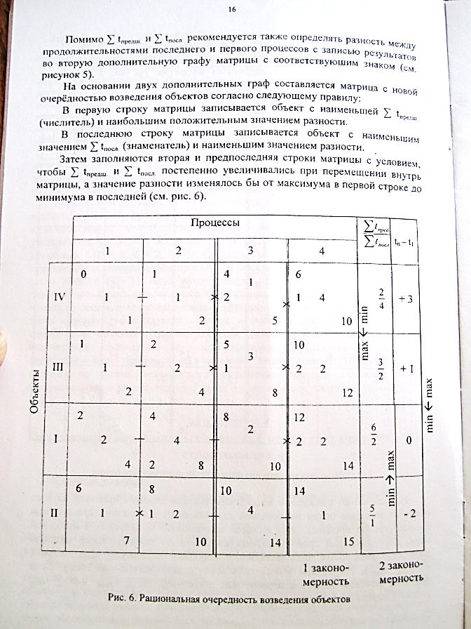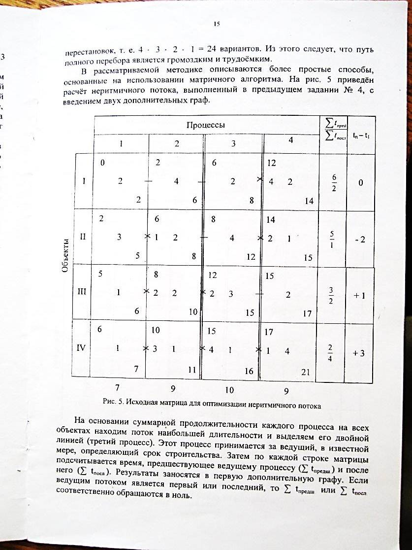 Помимо Σ tпредц и Σ tпосл рекомендуется также определять разность между продолжительностями последнего и первого процессов с записью результатов во вторую дополнительную графу матрицы с соответствующим знаком (см. рисунок 5). На основании двух дополнительных граф составляется матрица с новой очерёдностью возведения объектов согласно следующему правилу: В первую строку матрицы записывается объект с наименьшей Σ tпредц (числитель) и наибольшим положительным значением разности. В последнюю строку матрицы записывается объект с наименьшим Σ tпосл (знаменатель) и наименьшим значением разности. Затем заполняются вторая и предпоследняя строки матрицы с условием чтобы Σ tпредц и Σ tпосл, постепенно увеличивались при перемещении внутрь матрицы, а значение разности изменялось бы от максимума в первой строке до минимума в последней (см. рис. 6). Произведённый расчёт показал, что при новой очерёдности возведения объектов срок строительства сократился на 6 принятых единиц времени по сравнению с первоначальным вариантом. В случае, если изложенные выше правила распределения объектов по строкам матрицы противоречат друг другу, то рекомендуется применять их порознь, т. е. сначала построить одну матрицу, руководствуясь значениями Σ tпредц и Σ tпосл, а затем другую - по разностям продолжительностей последнего и первого процессов (tn-t1). Указанный метод определения очерёдности строительства объектов в 80 % случаев даёт сокращение сроков строительства. Сокращение сроков строительства может быть достигнуто также за счёт совмещения процессов, когда последующий процесс начинают, не дожидаясь полного окончания предыдущего, путём деления объектов на участки. На рис. 7 показан рассмотренный выше неритмичный поток, выполняемый совмещение благодаря разбивке каждого объекта на два участка. Произведённый расчет показывает, что общий срок строительства уменьшился до 13 принятых единиц времени с одновременным сокращением продолжительности возведения каждого объекта.