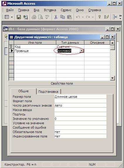 5. Створити таблицю " Додаткові відомості". Всі дії схожі на попередні, тільки поле прізвище має тип даних " Мастер подстановок". Це означає, що ця таблиця буде пов'язана з іншою полем " Прізвище". Властивості цього поля доцільно задати після заповнення всіх інших полів і вибору ключового поля («Код»).