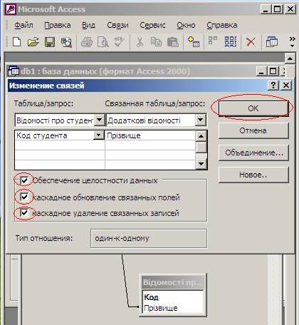 7.5. Вікно повинно прийняти наступний вигляд. Зв'язок 1-1 (один до одного) показує, що із основної таблиці " Відомості про студентів" до таблиць " Додаткові відомості" та " Відомості про батьків" можна взяти одного студента тільки один раз. Зв'язок 1-∞ (один до безкінечності) показує, що із основної таблиці " Відомості про студентів" до таблиці " Результати сесії" одного студента можна взяти довільну кількість разів. Тип зв'язку 1-1 вказувався нами при виборі властивості поля " Индексированное поле" - " Да (совпадения не допускаются)". Відповідно 1-∞ - " Да (совпадения допускаются)".
