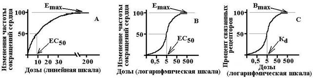 Схема 3. Градуальные кривые зависимости «доза-эффект». А – зависимость изменения частоты сердечных сокращений от дозы лекарства в нормальных координатах, В – та же кривая в полулогарифмических координатах (одна из шкал переведена в форму десятичных логарифмов), С – кривая связывания того же вещества с рецепторами миокарда. Emax – максимальный эффект, Bmax – максимальное число связанных рецепторов, ЕС50 – концентрация лекарства при которой возникает эффект равный половине максимального, Kd – константа диссоциации вещества от рецептора, при которой связано 50% рецепторов. На основании построения таких кривых можно определить два важнейших показателя, характеризующих каждое лекарство: активность и эффективность. · Активность (сила лекарства) – параметр, который показывает какая доза (концентрация) лекарства способна вызвать развитие стандартного эффекта, равного 50% от максимально возможного для этого лекарства. Т.е. активность лекарства численно характеризуется величиной ЕС50 или ED50. Чем выше активность лекарства, тем меньшая его доза требуется для воспроизведения терапевтического эффекта. · Эффективность – это способность лекарства оказывать максимально возможное для него действие. Т.е. фактически это максимальная величина эффекта, которую можно достигнуть при введении данного лекарства. Эффективность численно характеризуется величиной Еmax. Чем выше Еmax, тем выше эффективность лекарства.