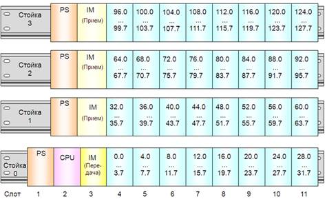 Слоты также имеют фиксированные адреса в многорядныхконфигурациях. Примеры •Q7.7 – последний бит 32-канального DO-модуля, вставленного впятый слот 5 стойки 0. •IB105 – второй байт DI-модуляв шестом слотестойки 3. •QW60 – первые два байта DO-модуля в 11 слотестойки 1. •ID80 – все четыре байта 32-канального DI-модуляв восьмом слоте стойки 2.