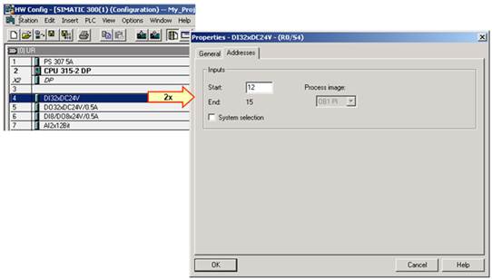 Адресацияс учетом слота. Модулям назначаются фиксированные зависящие от слота адреса встанциях S7-300(CPU без DP-интерфейса) и в станциях S7-400™ (безконфигурации оборудования). Адресацияпеременных. Встанциях S7-300™ (CPU со встроенным DP-интерфейсом) и встанциях S7-400™ могут назначаться параметрыдля стартовых адресов модулей. При двойном щелчке на дискретном или аналоговом модулеоткрывается окно для назначения параметров. После выборавкладки" Addresses" (" Адреса"), Вы можете отменить опцию " System selection" (" Выбор системы"). После этого можноопределитьначальный адрес в окне " Start" (" Начальный"). Если введенный адрес уже используется, то выводится сообщение об ошибке.