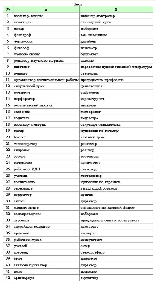 Инструкция: " Из каждой пары профессий нужно указать одну, предпочитаемую. Всего 42 выбора".