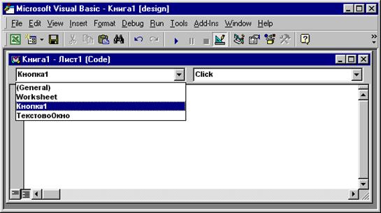 Рис. 5. Теперь перейдем к обработке событий. Наша задача сделать так, чтобы при щелчке по кнопке в текстовое окно выводился текст (например, Пример вывода текста). Разберем - как это сделать. Для начала перейдите в режим конструктора. После этого необходимо перейти в среду для написания кода (или текста) программы. Это уже новый и очень важный шаг. Для этого дважды щелкните по созданной кнопке (Кнопка1). Другой способ перехода в среду для написания кода – меню Сервис, далее пункты Макросы и Редактор Visual Basic). В результате перед Вами появится новая среда редактора кода (рис.6). Здесь требуется сначала сделать выбор объекта, а затем для выбранного объекта можно написать содержимое процедуры, выполняемой при определенном событии. Наша задача - обеспечить вывод в текстовое окно сообщения при щелчке по кнопке. Для этого в левом списке (рис.6) необходимо выбрать Кнопка1 (объект который нас интересует), а затем в правом Click (другими слова щелчок по кнопке). На рис.7 показан результат – на экране появляется окно процедуры, которая будет выполняться при щелчке по кнопке.