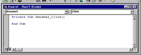 Рис. 6. Первое слово Private говорит о том, что это внутренняя процедура только для данного листа. Поэтому для других листов эта процедура недоступна. Пока данный параметр мы менять не будем, заметим только что альтернативным вариантом является Public (общая процедура – в этом случае доступна для других листов). Слово Sub говорит о том, что это процедура. Дальнейшая запись Кнопка1_Click() – имя процедуры. Это имя формируется автоматически из двух составляющих - Кнопка1 (имя кнопки)и Click (действие – щелчок по кнопке). Это так называемая предопределенная процедура – она существует и выполняется всегда - когда мы щелкаем по кнопке.