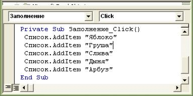 Рис. 12. Необходимо обеспечить выполнение следующих действий: · по щелчку по кнопке Заполнение список заполняется строками – яблоко, груша, слива, дыня, арбуз; · по щелчку по полю со списком выбранный элемент помещается в текстовое окно слева; · по щелчку по кнопке Очистка текстовое окно и поле со списком очищаются – становятся пустыми. Для заполнения поля со списком по щелчку по кнопке Заполнение необходимо процедуру Заполнение_Click() оформить так как показано на рис. 13.